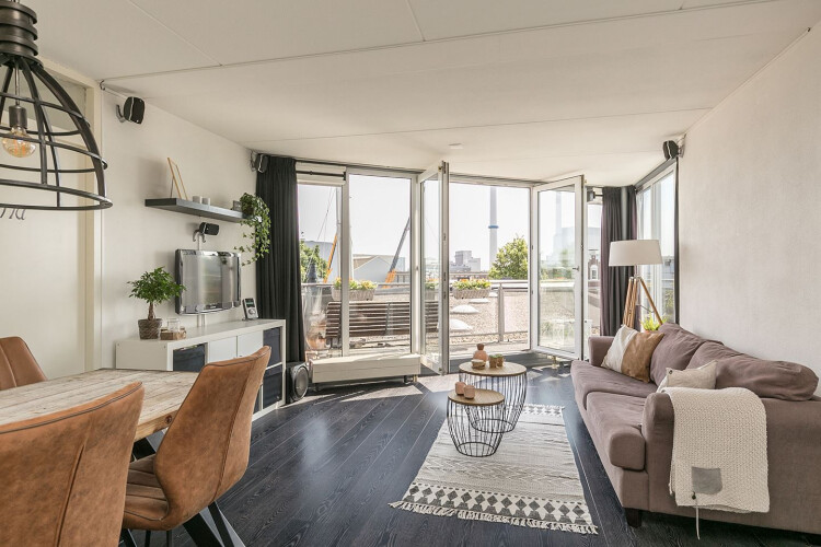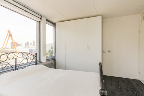 FURNISHED 2-ROOM PENTHOUSE APARTMENT WITH 15 M2 ROOF TERRACE AND FREE VIEW towards the river Maas, the skyline of Rotterdam and the former cruise ship "SS Rotterdam".
