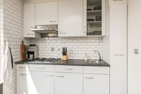 The living room (7.20 / 4.20x4.00m) has large windows, which provide a lot of light. Through double doors you have access to the roof terrace (15m2) on the corner. From the living room you have access to the bedroom, which is royal sized and easily divided in two. The open kitchen (2.55x2.55m) has a wall setup and is equipped with a 5-burner stove, hood, sink and ample closet space.