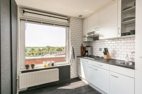 De woonkamer (7.20/4.20x4.00m) beschikt over grote raampartijen, die zorgen voor veel lichtinval. Middels openslaande deuren heeft u toegang tot het op de hoek gelegen dakterras (15m2). Vanuit de woonkamer heeft u toegang tot de slaapkamer deze is royaal en eenvoudig in tweeën te splitsen. De open keuken (2.55x2.55m) heeft een wandopstelling en is voorzien van een 5-pits gasfornuis, afzuigkap, spoelbak en voldoende kastruimte.
