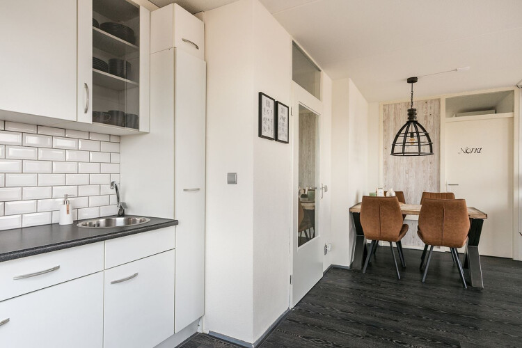 In the kitchen is also the connection for the washing machine. Bedroom 1: located at the front with door to the bathroom, 4.30x2.75m The fully tiled bathroom (2.20x1.85) has a shower, sink and toilet. Roof terrace: a spacious L-shaped roof terrace of approx. 15 m2 located on the southeast with uninterrupted views towards the river Maas, the skyline of Rotterdam and the former cruise ship "SS Rotterdam"