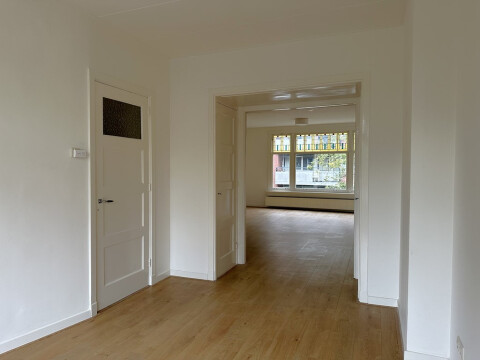 Entree van de woning met een gang / hal met toilet met fonteintje, meterkast, en trapopgang naar de derde etage. De sfeervolle L-vormige woonkamer is gelegen aan de voorzijde van de woning, nette wanden, met 2 vaste kasten en glas-in-lood bovenramen. De achterkamer wordt gebruikt als eetkamer en beschikt over 2 vaste kasten en openslaande deuren naar het balkon. De moderne keuken is afgewerkt met een kunststof werkblad en keukenkastjes, voorzien van koel- en vriescombinatie, oven en afzuigkap en voldoende kastruimte.