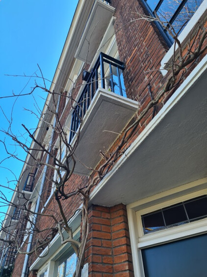Het balkon aan de achterzijde kijkt uit op de achtertuinen van alle panden en beidt een fijne stilte om te genieten van de buitenlucht, maar het park aan de voorzijde biedt meer ruimte en groen.