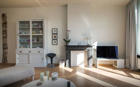 Entrance, landing with modern toilet. Large bright open living room with balcony on the front side. Open dining area with access to the open and modern kitchen with luxurious inbuilt equipment, such as dishwasher, oven, 2nd microwave/oven, refrigerator and freezer, gas stove with 5 burners. On top of that the kitchen is equipped with a Quooker system for instant hot (boiling) water for tea or cooking. From the kitchen you have access to the balcony on the backside.