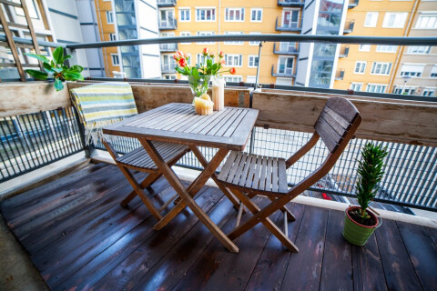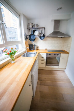 Heel ruim en gezellig appartement. Via de entree, kom je in de hal met daarin de trap, naar de lichte woonkamer en keuken.