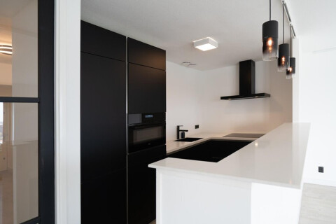 Dit 3-kamer appartement op de 16e verdieping is volledig gemoderniseerd en van alle gemakken voorzien, zoals diverse luxe inbouwapparatuur en vloerverwarming. De stijl is modern chic met plafondhoge deuren, glazen tussendeur naar de woonkamer, badkamer met inloopdouche en ligbad.