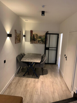 Entrance to hallway. Spacious and bright living room with open kitchen with built-in appliances. and a good sized bedroom. Luxurious bathroom with toilet. Sunny garden for the summer. The apartment has been fully renovated with attention to design and comfortability, fitted with wooden flooring throughout, steel industrial doors, double glazed windows and brand new furniture.
