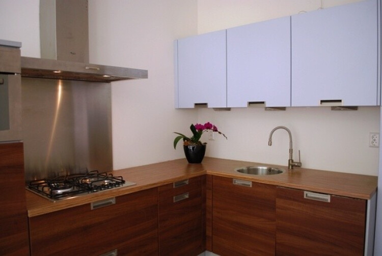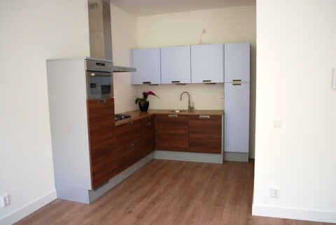 Gesloten bellentableau, entree op eerste etage, hal, luxe badkamer met douchecabine, badmeubel en toilet, ruime woonkamer met moderne open keuken voorzien van gasfornuis, afzuigkap, vaatvasser en koel-vriescombinatie, slaapkamer. Gehele woning voorzien van houten vloer.