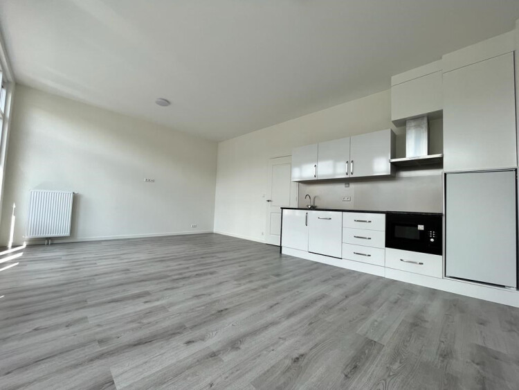 Indeling: centrale entree op de begane grond, waarna trap naar de eerste etage. Entree appartement via voordeur welke toegang geeft tot een ruime hal. Vanuit de hal toegang tot alle vertrekken. Woonkamer met open keuken aan de achterzijde gelegen van ca.: 29 m2. Vanuit de woonkamer toegang tot het ruime balkon van ca.: 7 m2. Aan de voorzijde gelegen 2 slaapkamers van ca.: 8 m2 en ca.: 12 m2. Badkamer met wastafelmeubel, inloopdouche en wasmachineaansluiting. Apart toilet gelegen naast de badkamer. De gehele woning is volledig gerenoveerd en voorzien van mooie, luxe keukenapparatuur (vaatwasser, inductiekookplaat, combi oven/magnetron en koel/vriescombinatie).