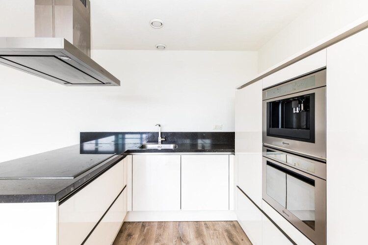 - open luxe keuken voorzien van inbouw koffiezetapparaat, vaatwasser, combi magnetron, 5-pits inductiekookplaat en afzuigkap, een zwart natuurstenen blad