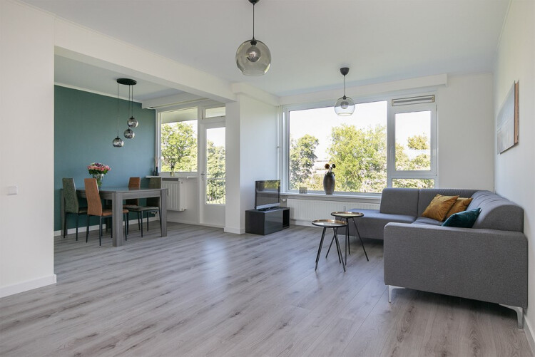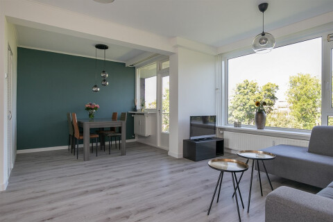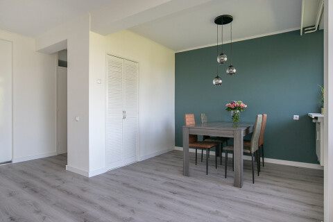 Aan de achterzijde van de woning bevindt zich de royale woonkamer, ingedeeld in een eet- en zit gedeelte met veel lichtinval door de vele ramen en toegang tot het balkon gelegen op Oost, welke is voorzien van nieuwe houten vlonders. In het eetgedeelte past een ruime eettafel, waar u samen met familie en vrienden kan genieten van een culinaire avond. De woonkamer is verder voorzien van een fraaie nieuwe laminaatvloer en wandafwerking.