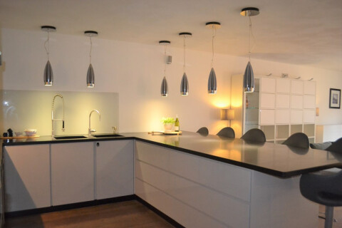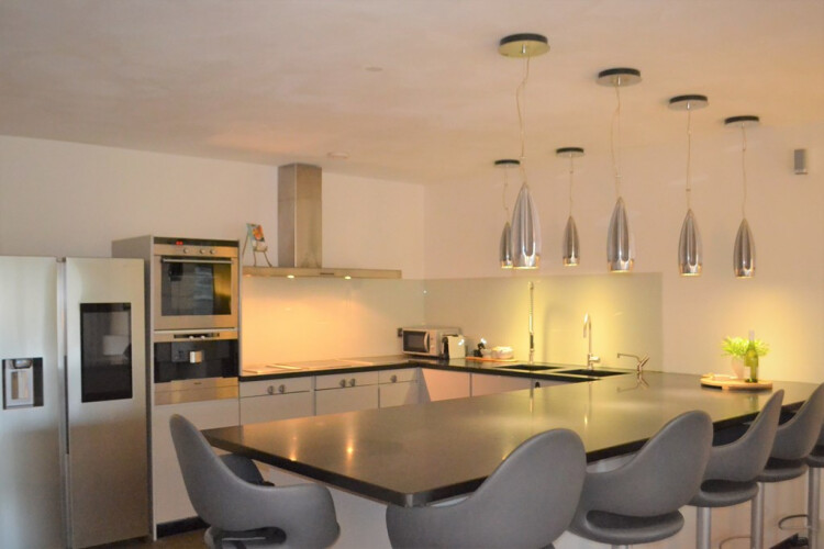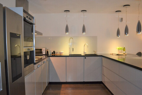 entree, hal, apart toilet met fonteintje, bergruimte met wasmachine en droger, ruime lichte woonkamer (55m2) met een mooie houten eiken vloer, grote ramen naar de grond, meubilair van hoge kwaliteit. Volledig ingerichte open keuken met Liebherr wijn / ijs / koelkast / vriezer, Gaggenau 2-pits inductiekookplaat, Gaggenau wok inductieplaat, Gaggenau Tepan Yaki bakplaat, Miele Nespresso ingebouwd koffiezetapparaat, Siemens magnetron, Siemens vaatwasser, Quooker (2 liter ), warmhoudlade en een Boretti-afzuiger.